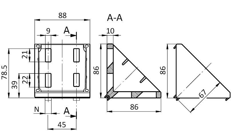 To connect two aluminum profiles or panels at right angles; the connection angle can be closed with the cover cap