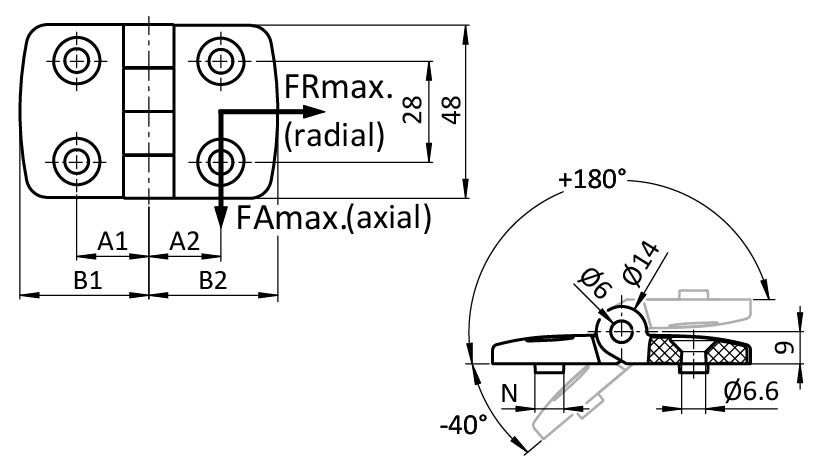 | Número de producto | A1 (mm) | Ranura N (mm) | Version | B1 (mm) | A2 (mm) | Combinación | B2 (mm) | FAmax (N) | FRmax (N) |