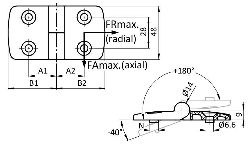 | Número de producto | B1 (mm) | A1 (mm) | Version | Ranura N (mm) | Combinación | B2 (mm) | FAmax (N) | FRmax (N) | A2 (mm) |