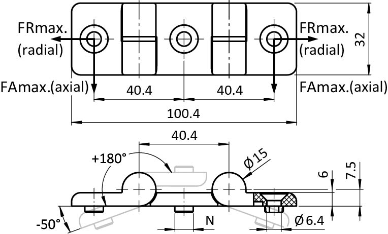 Información sobre el producto "Bisagra de plástico 32 x 100, doble, negro"
