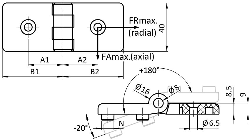 To hinge panels or aluminum profiles; each side has two holes for centering bolts