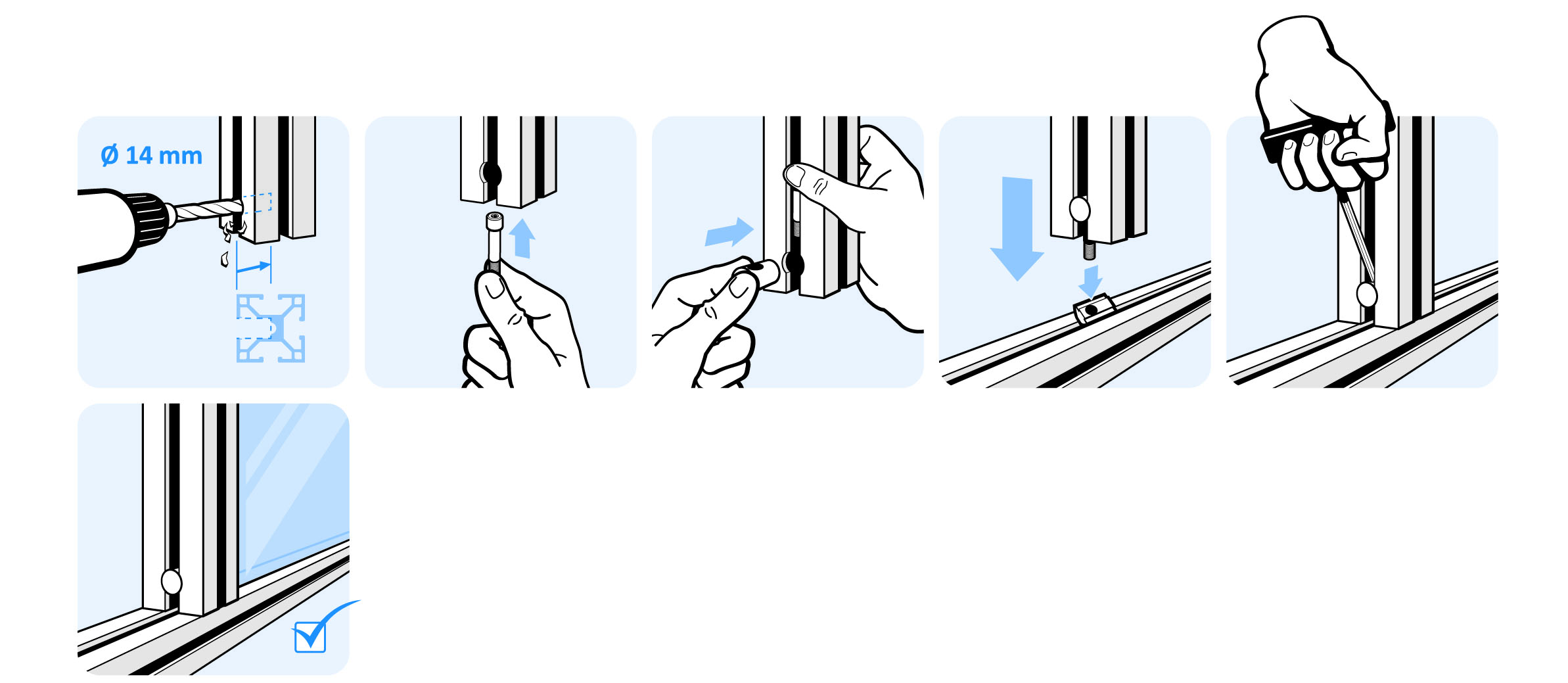 To connect two aluminum profiles at right angles; a hole with Ø 14 mmmust be drilled lateral through one of the profiles