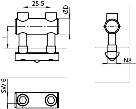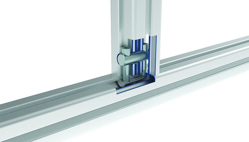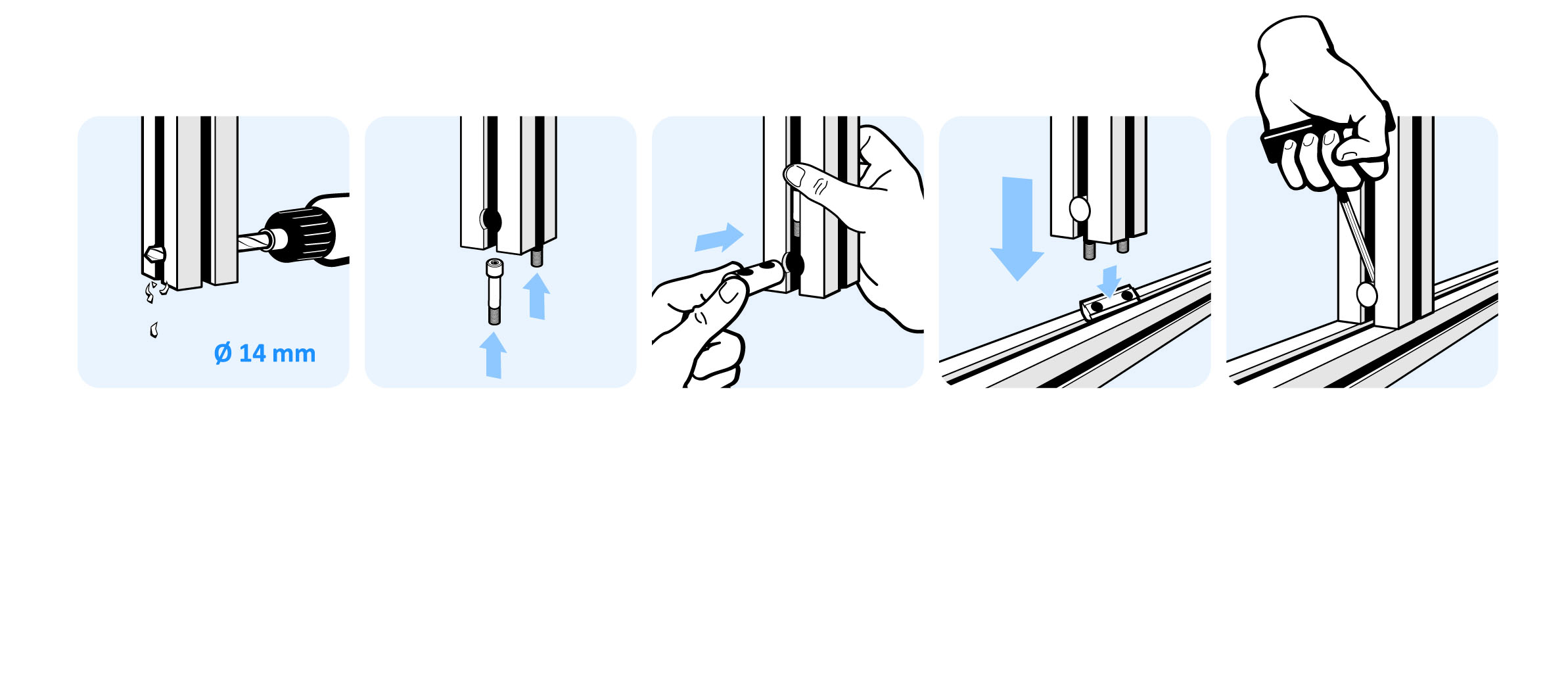 To connect two aluminum profiles at right angles; a hole with Ø 14 mmmust be drilled lateral through one of the profiles