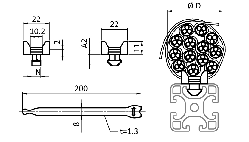 To fix cables to aluminum profiles in two directions; can be mounted into the slot by a quarter turn