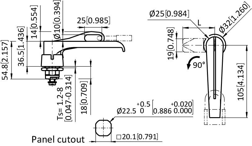 Información sobre el producto "Cuarto de Vuelta de Palomilla con Maneta en L para Candado 22.5 / 18"