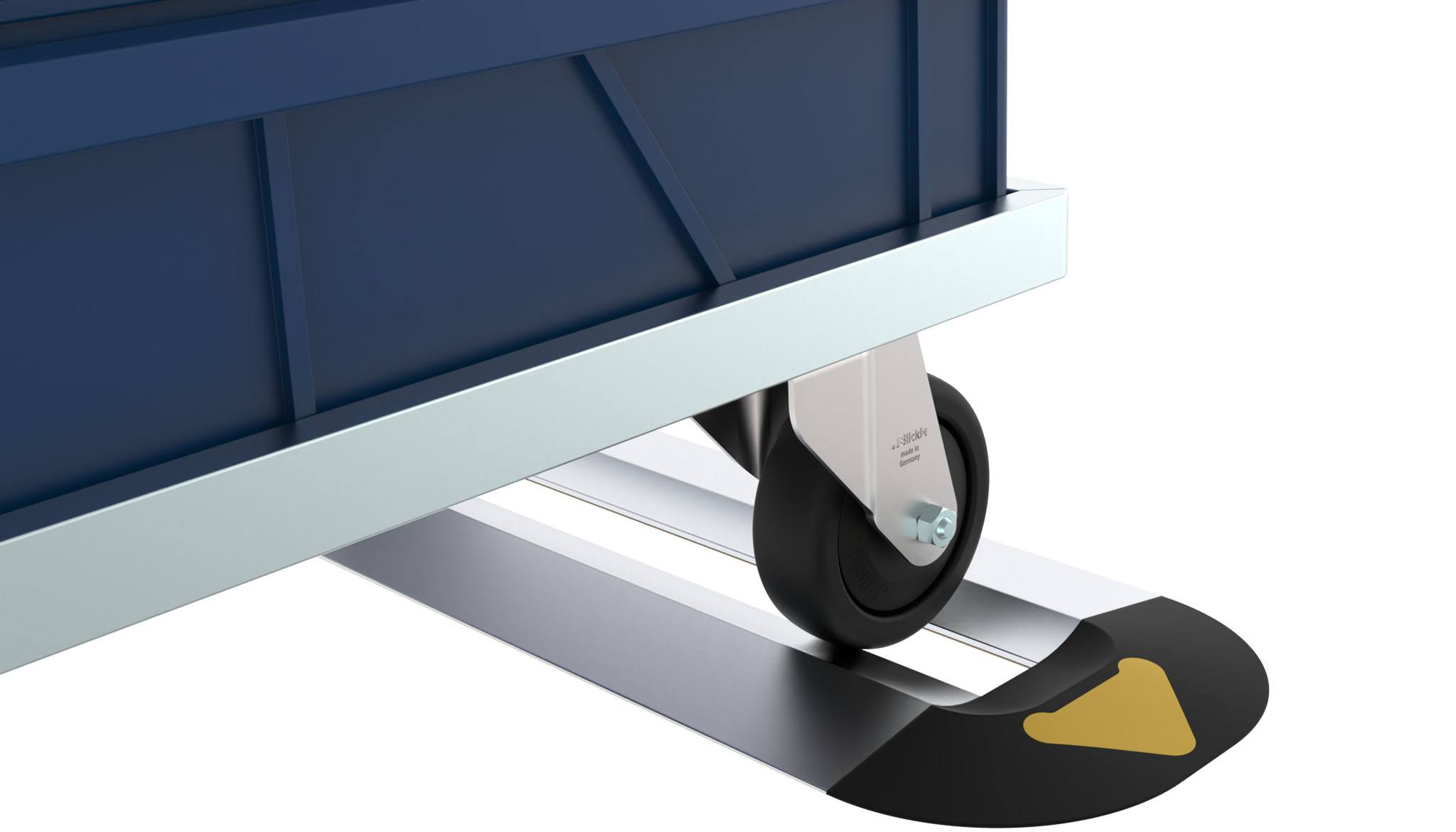 Yellow position markings with signal effect to indicate the position of the wheels from floor dollys or material trolleys in the parking rail