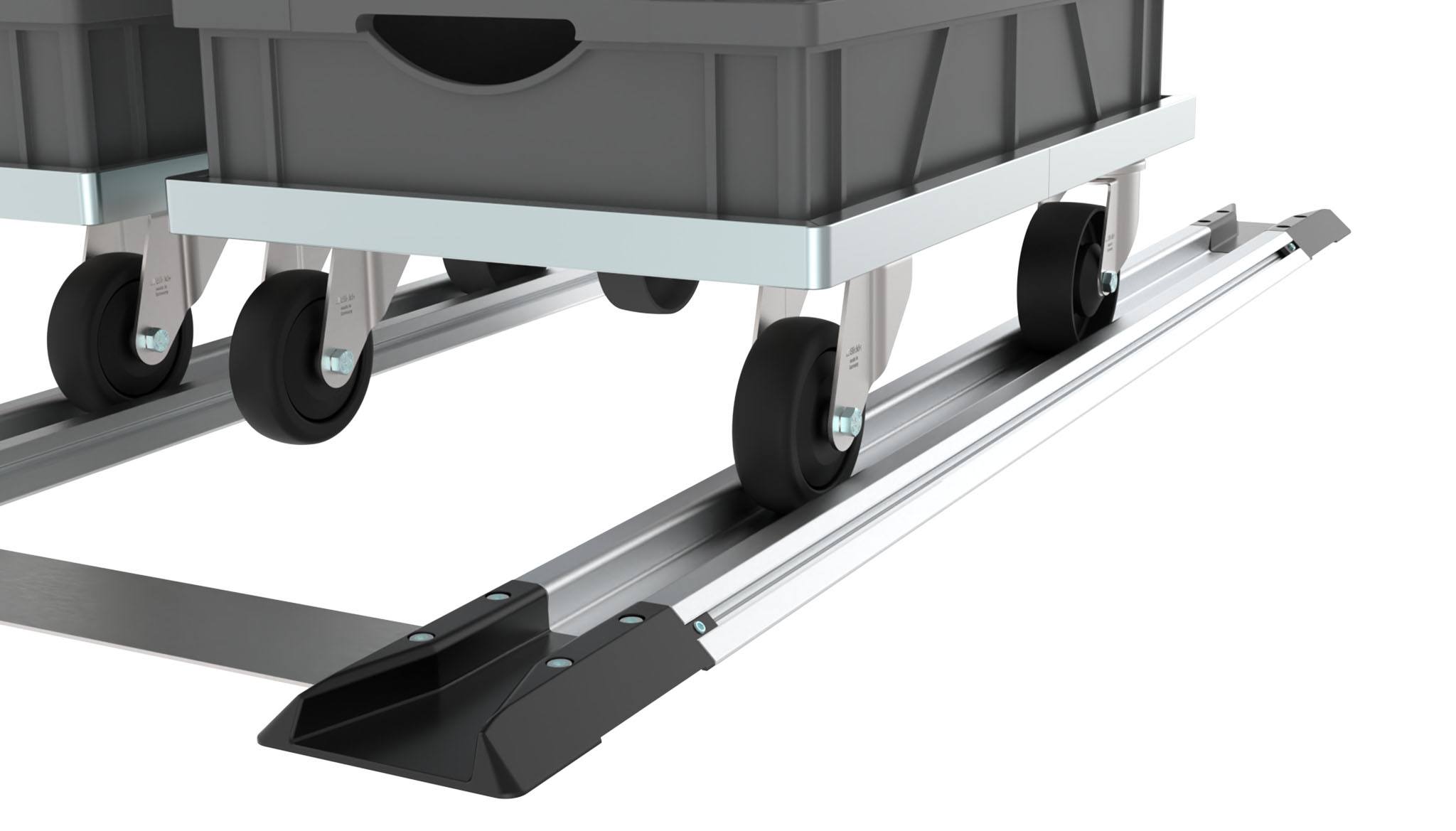 Fast mounting FIFO station for guiding floor dollies on one side in FIFO stations, with a wheel width of up to 40 mm;