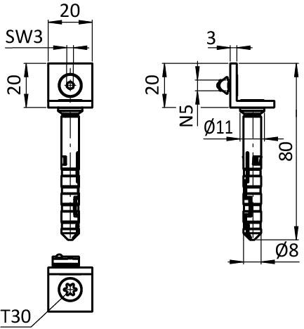 2 screws DIN EN ISO 10642 (DIN 7991) - M5 x 8; 2 T-slot nuts - slot 5 - M5,