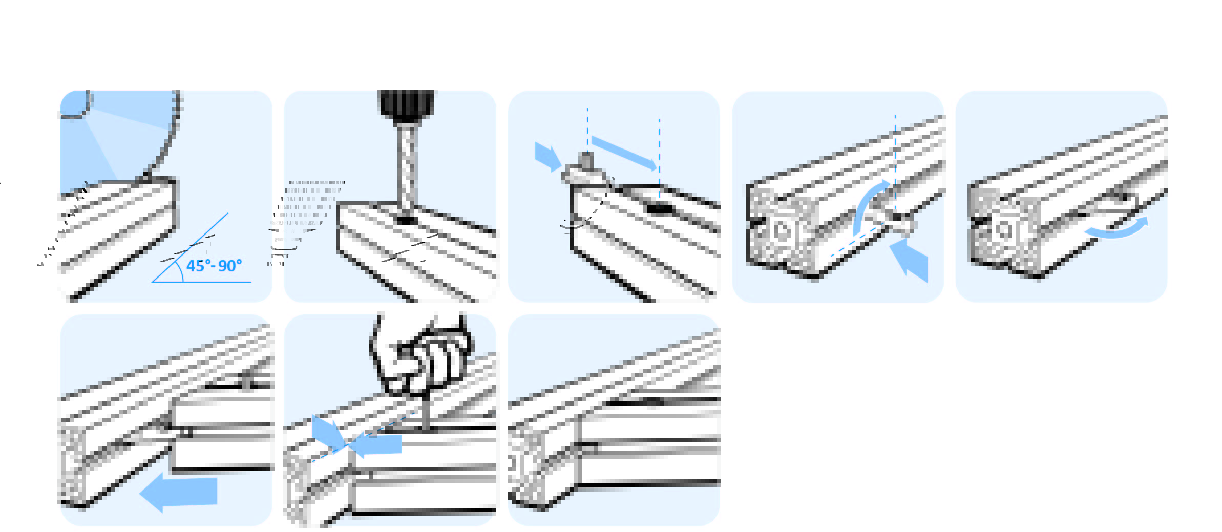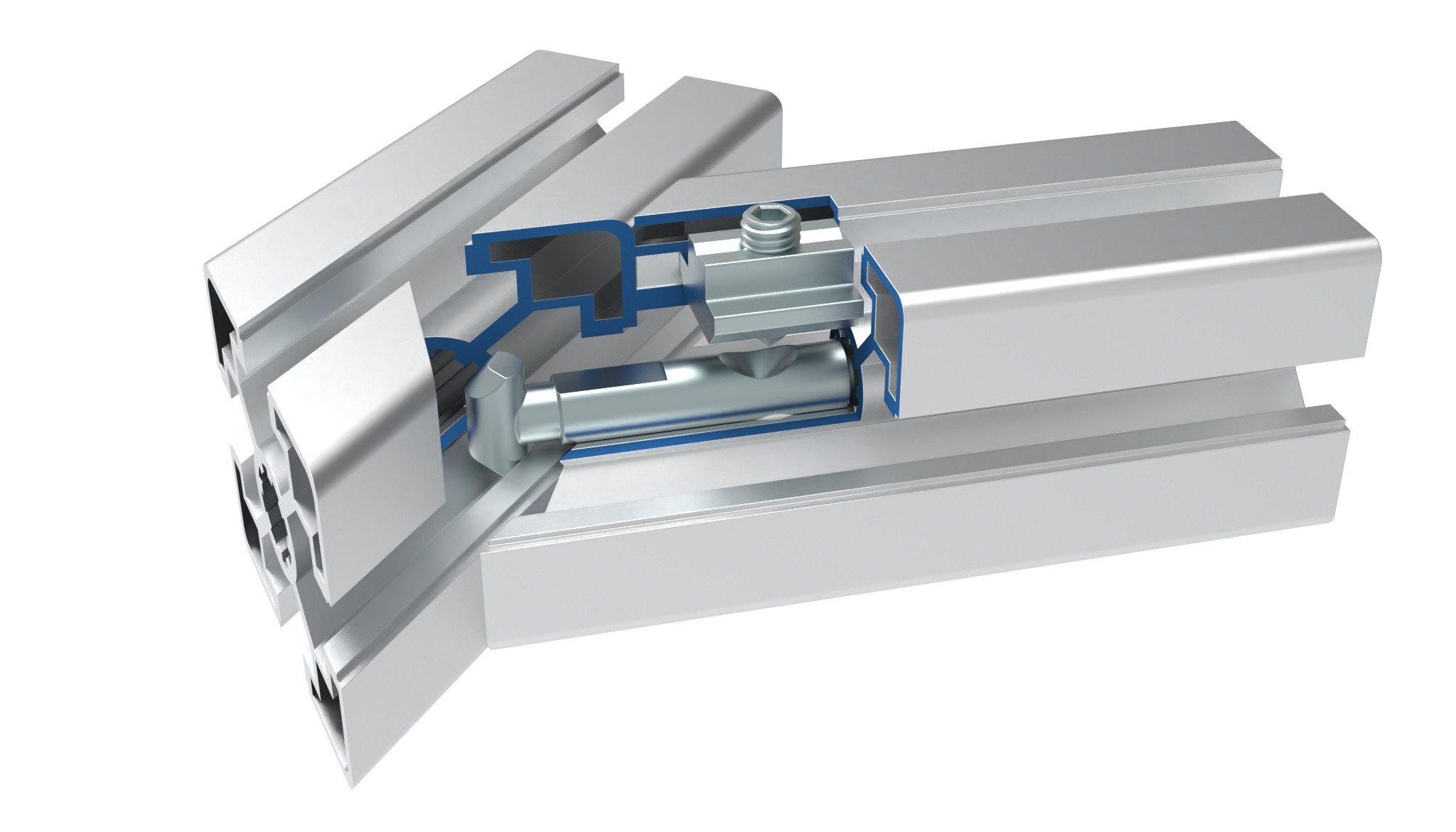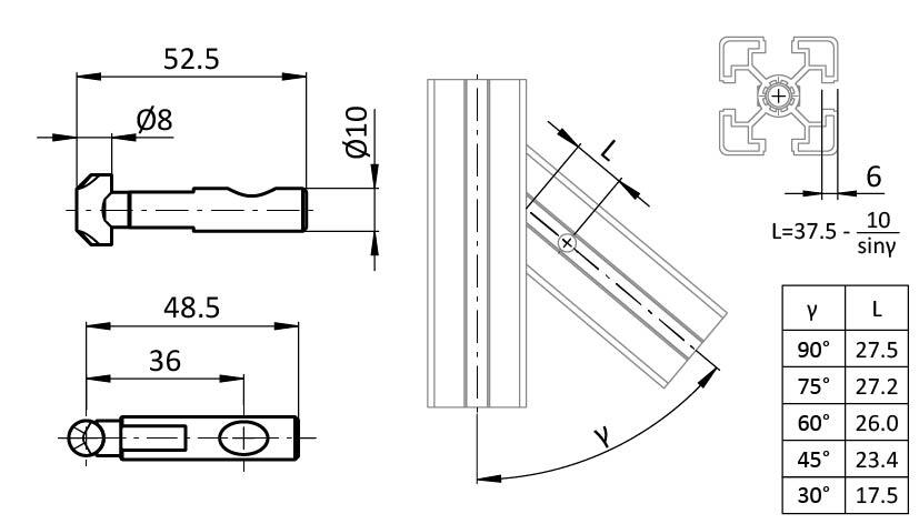 End-to-end connection of an aluminum profile with a mitre cut (cut γ = 45° - 90°) to another aluminum profile; before the application a hole with Ø 8.2 mm lateral must be drilled; with T-slot nut and threaded pin with AF 4