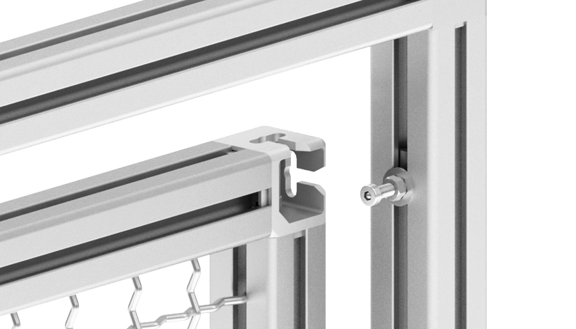 To attach frame elements to a frame structureby means of clamp profile connectors; completely preassembled, for lateral insertion into the profile slot, fixation by means of a nut; the upper monting defines the position in the structure, by shifting the lower mouting afterwards the frame can be fixed and locked; 12 mm gap between frame and structure, dimensional tolerances of +/- 3 mm can be compensated