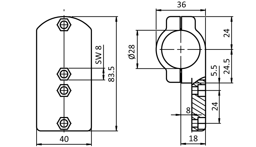 To laterally connect a tubular frame profilewith Ø 28 mm outer diameter to an aluminum profile, hole spacing compatible with Ergoswiss® lift cylinders