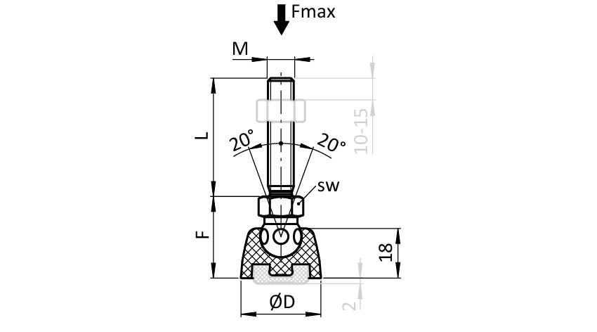 | Número de producto | F (mm) | Version | SW (mm) | D (mm) | Fmax (N) | Base | M x L (mm) |