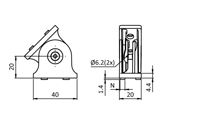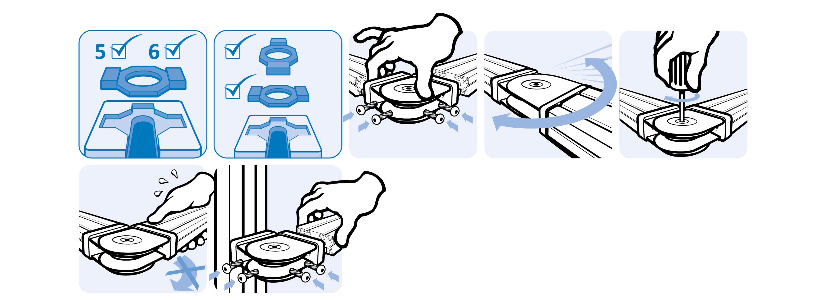 To make a pivoting connection between two profiles or panels; with separate locating pins for slot 5 and slot 6; by tightening or loosening the screws you can seamlessly regulate the functionality of the joint or you can fix it in one position