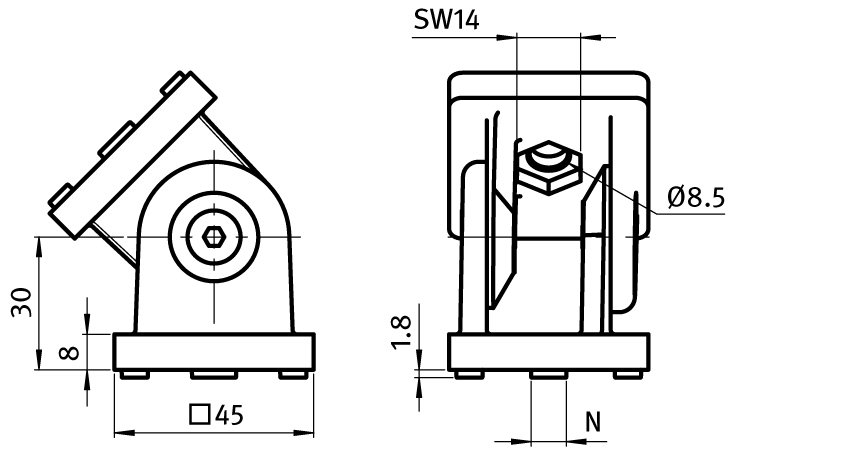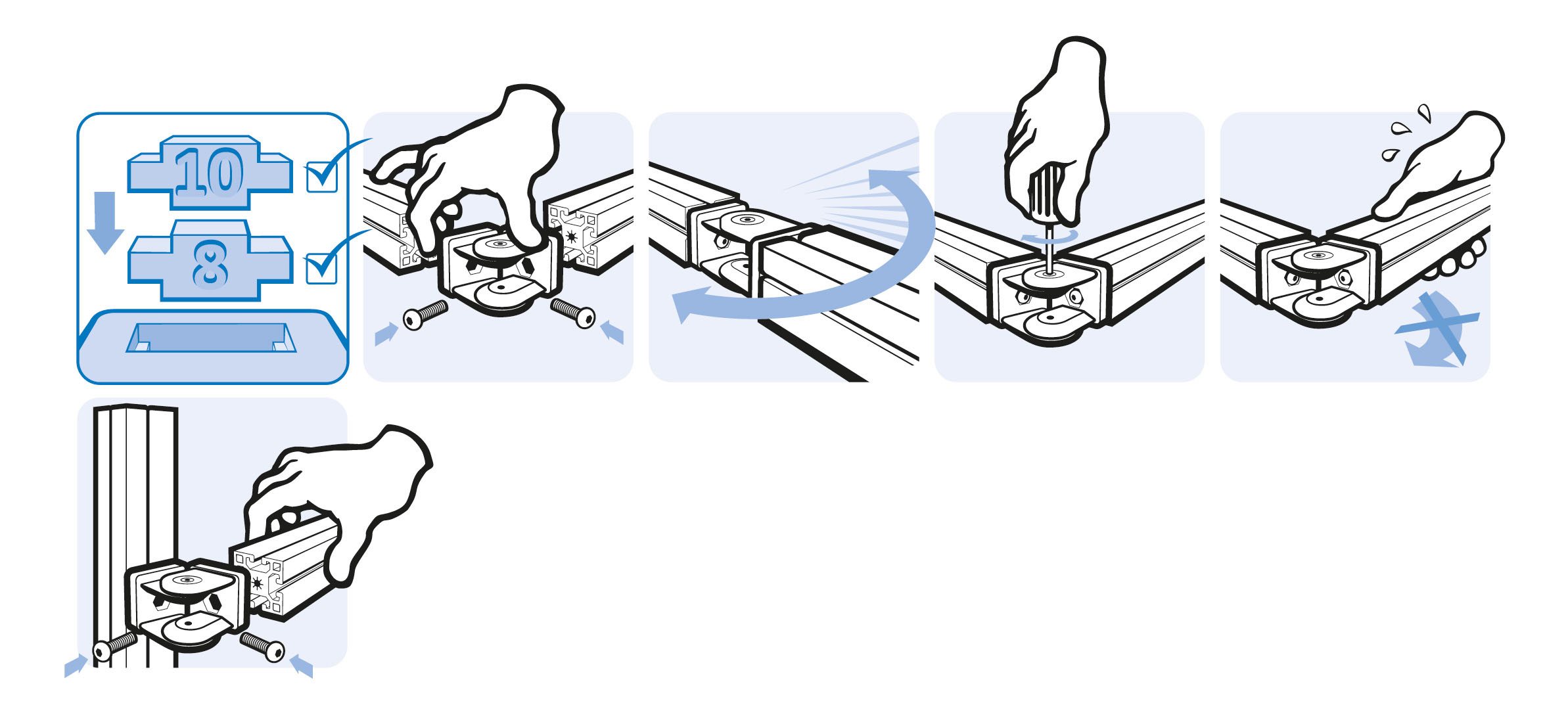 To make a pivoting connection between two profiles or panels; with separate locating pinsfor slot 8 and 10; by tightening or loosening the screws you can seamlessly regulate the functionality of the joint or you can fix it in one position