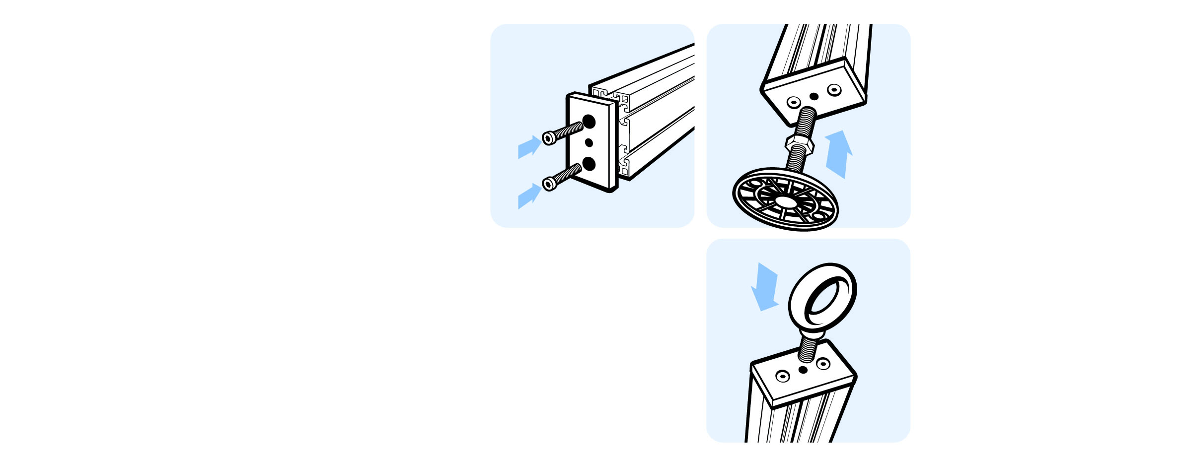 To mount leveling feet, rollers, hooks or similar components; connects to the profile sideways