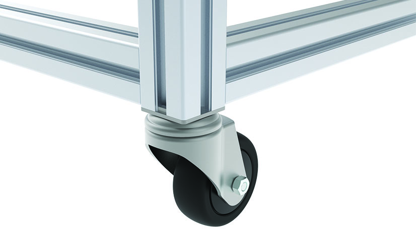 Reliable and quiet swivel caster, trackless (except solid rubber ESD electrostatical discharging), with ball bearings and thread guard; can be fixed to aluminum profiles; compatible with all swivel and fixed casters due to consistent height level with optional adapter plate S; no additional transport and base plate needed