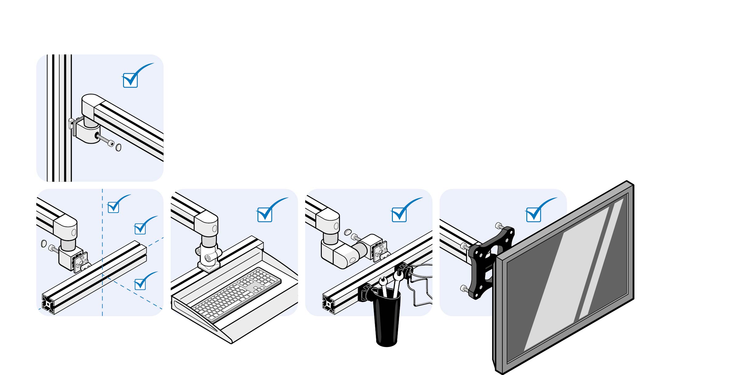 System arm can be attached lateral, transverse, or on the face of the profile; if attached on the front face, the core hole of the respective profile must be M8 threaded (min. 15 mm deep)