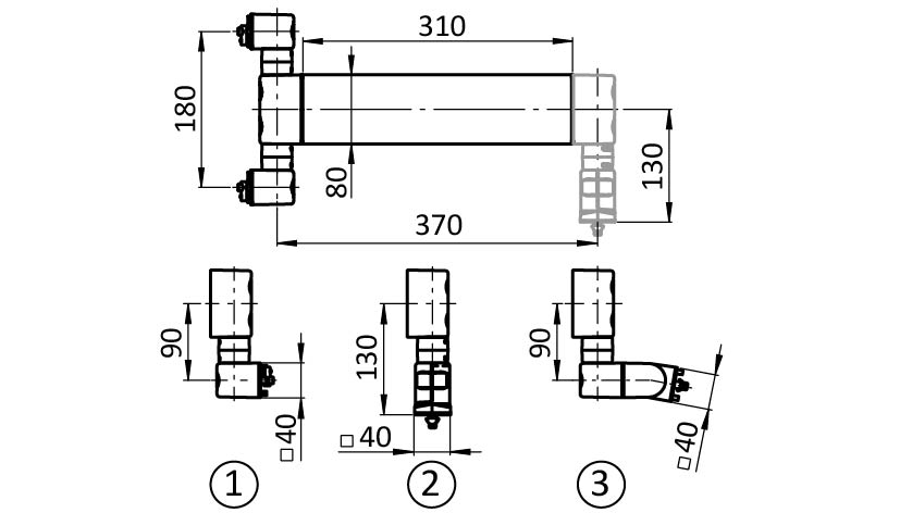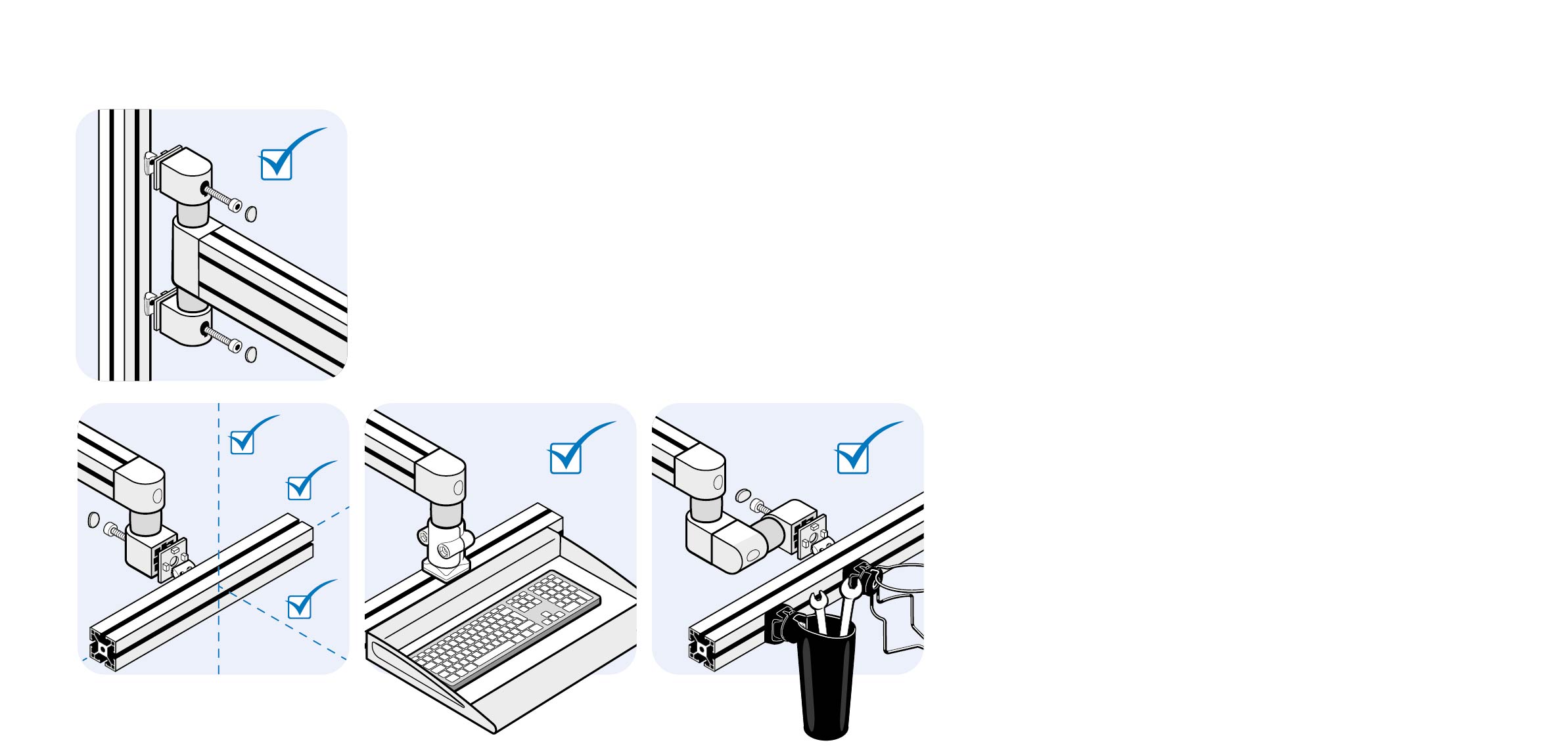 System arm can be attached lateral, transverse, or on the face of the profile; if attached on the front face, the core hole of the respective profile must be M8 threaded (min. 15 mm deep)
