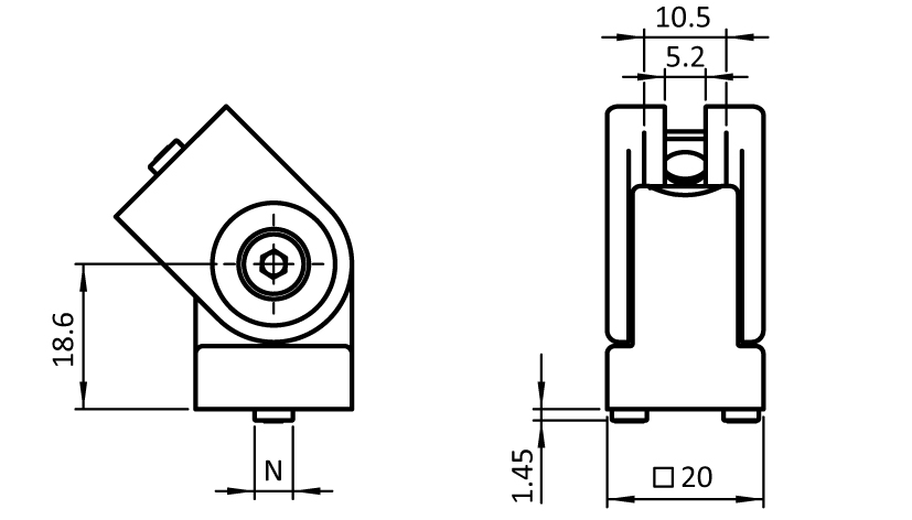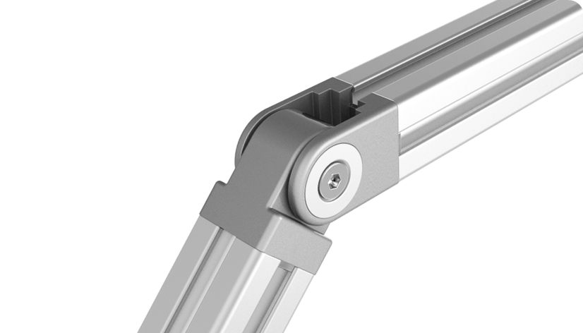For connection of two profiles or panels, with attachment at any angle, fixed locating pins for slot 5 or 6 optional; by tightening or loosening the screws you can adjust the frictional resistance of the joint continuously, or you can fix it at a defined position; thicker walls for stronger locking