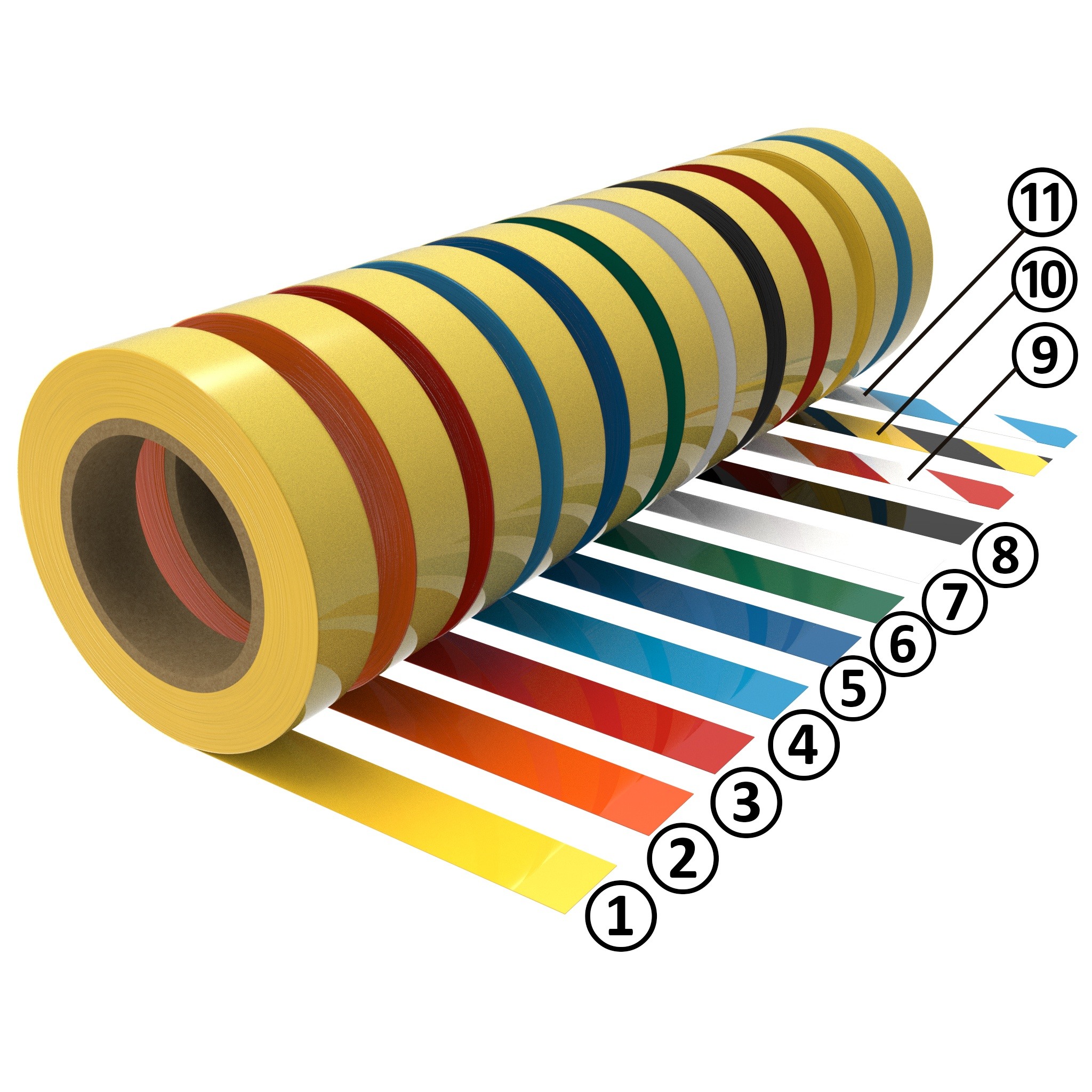 Jaune, orange, rouge, bleu, vert, blanc, noir, rouge / blanc, bleu / blanc, jaune / noir