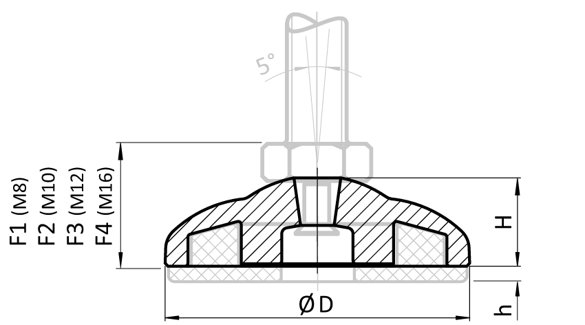 | Réf. produit | D (mm) | H (mm) | F2 (mm) | Fmax (N) | Version | F1 (mm) | F4 (mm) | h (mm) | F3 (mm) | Embase |