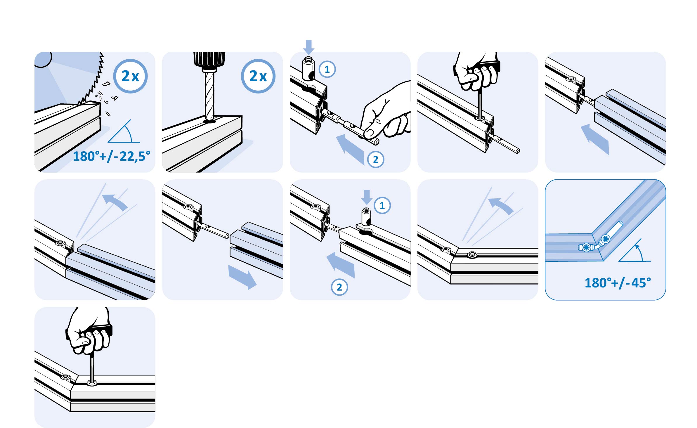 End-to-end connection of two aluminum profiles of the same type; a blind or through hole must be drilled before the assembly; bendable from 90° to 180°