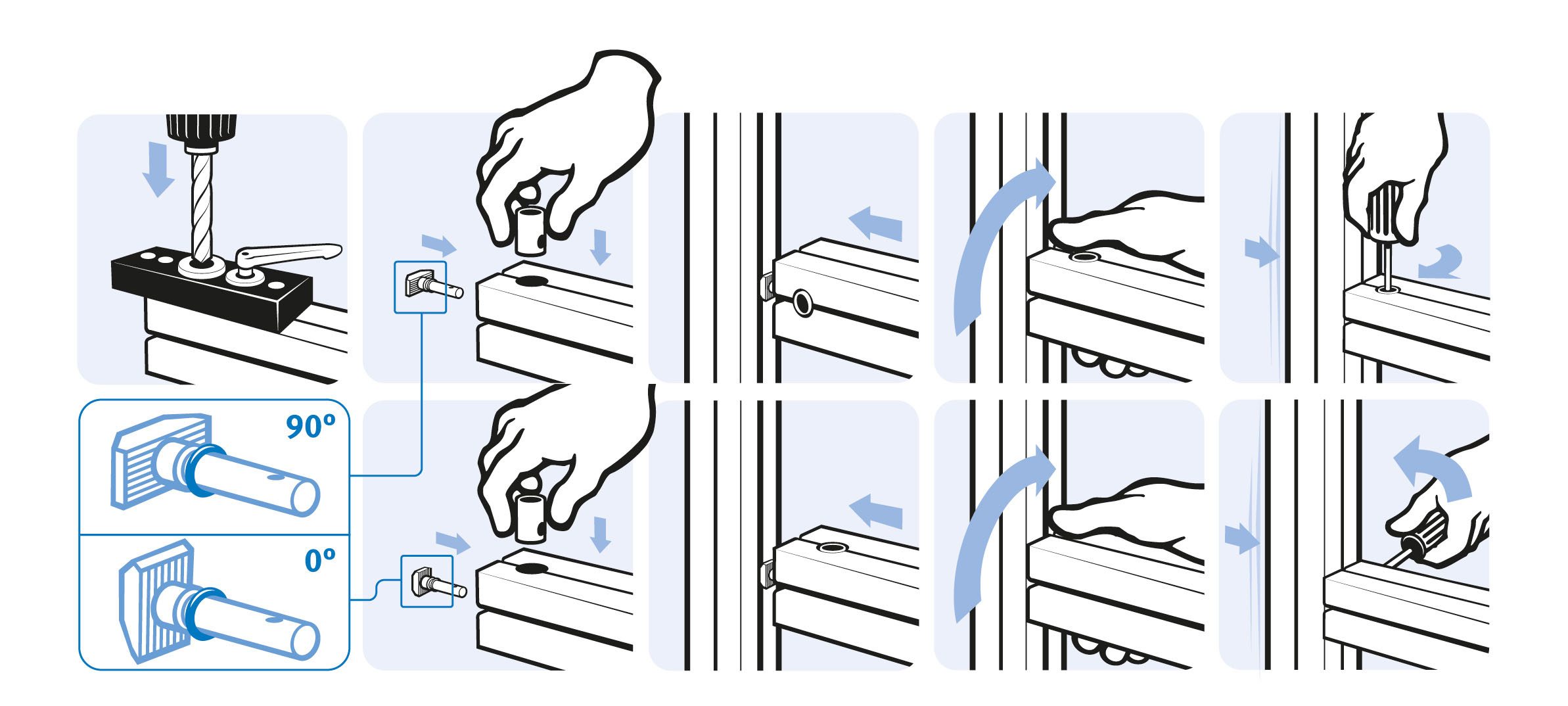 Pour connecter deux profilés aluminium à angle droit; un trou débouchant ou borgnetre percé au préalable sur la face d'un des 2 profilés pour assurer l'accès à la vis de serrage, la rainure n'en n'est pas affectée, la douille vient a fleur du fond de la rainure, laissant les deux rainures libres ; la rainure peut être complètement cachée par un cache rainure