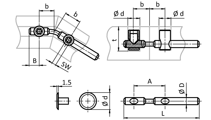 End-to-end connection of two aluminum profilesof the same type; a blind or through hole must be drilledbefore the assembly; bendable from 90° to 180°