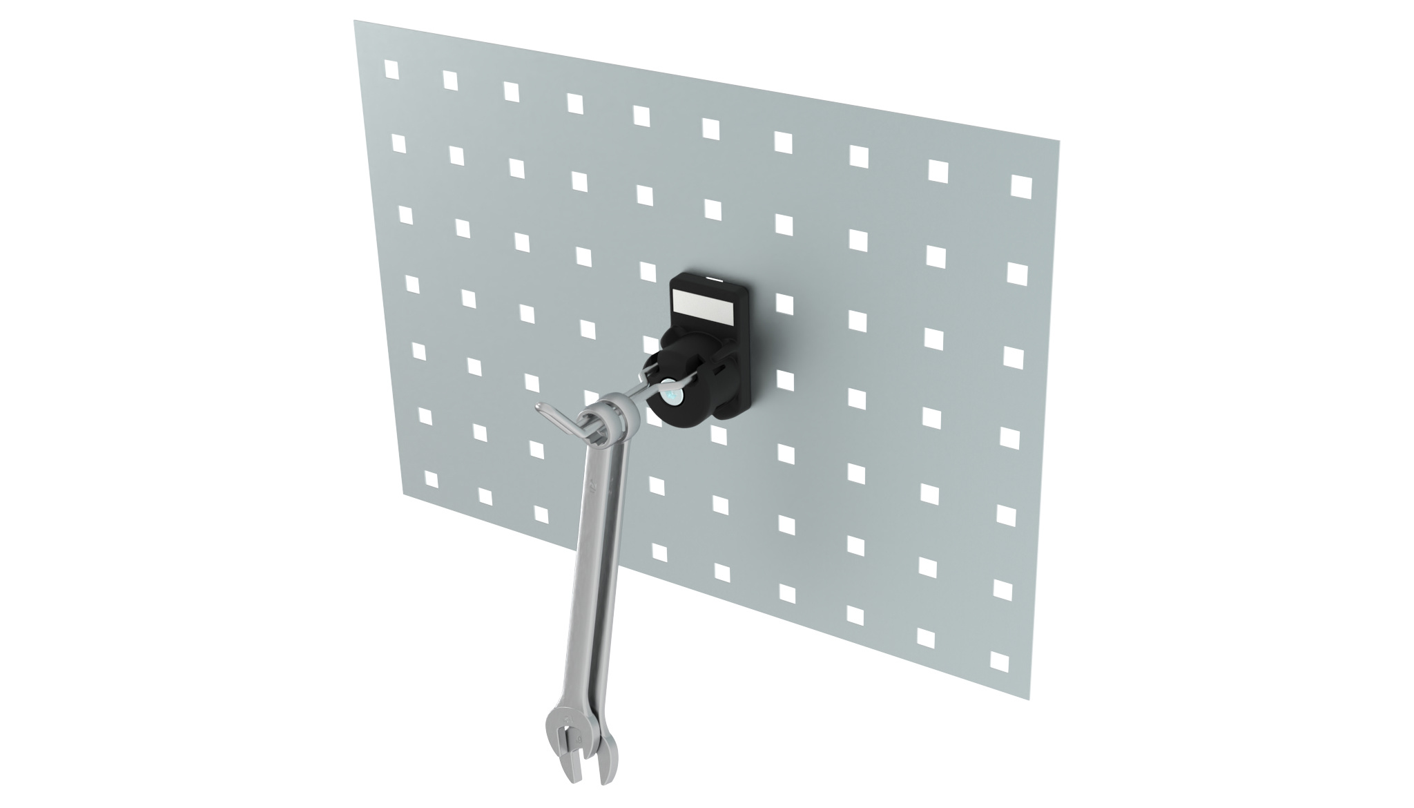 Crochet porte-outils prêt à l’emploi, pivotant à 360°, pour tôle perforée jusqu’à 1,4 mm d’épaisseur ;