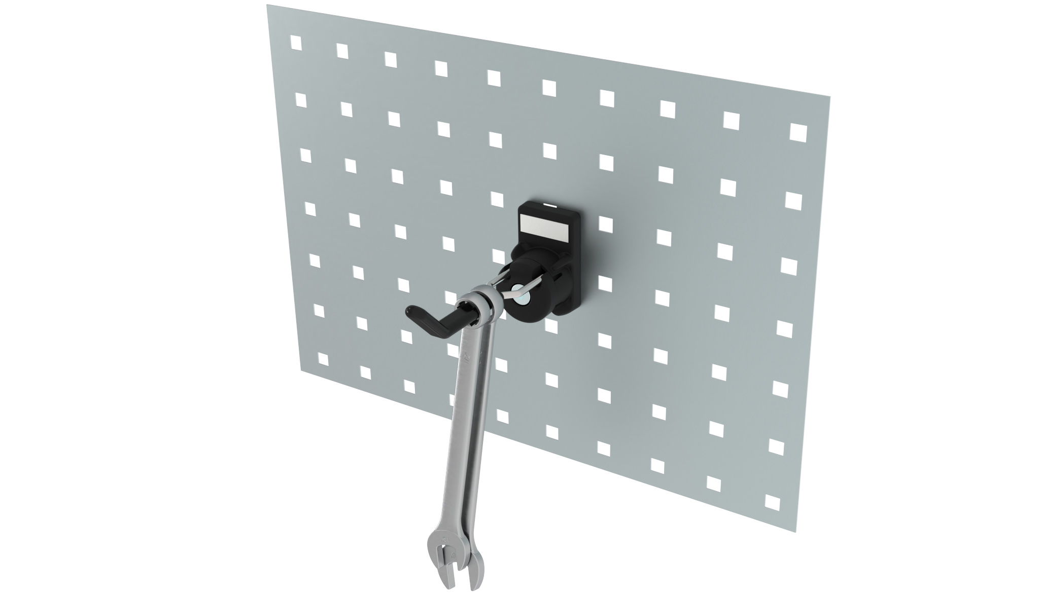 Crochet porte-outils prêt à l’emploi, pivotant à 360°, pour tôle perforée jusqu’à 1,4 mm d’épaisseur ;