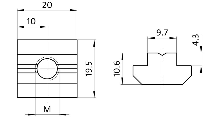 Ecrou de rainure en T 19,5 x 10,6 mm, h.4,3 mm