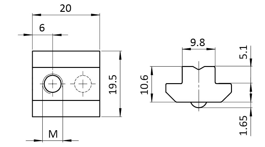 Informations sur le produit "Ecrou de rainure en T 19,5 x 10,6 mm, h.5,1 mm avec bille sur ressort"