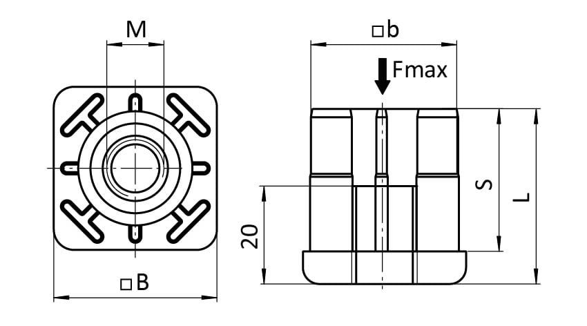 | ID de produit | Version | S (mm) | Fmax (N) | L (mm) | B (mm) | b (mm) | Tube Carré (mm) | M |