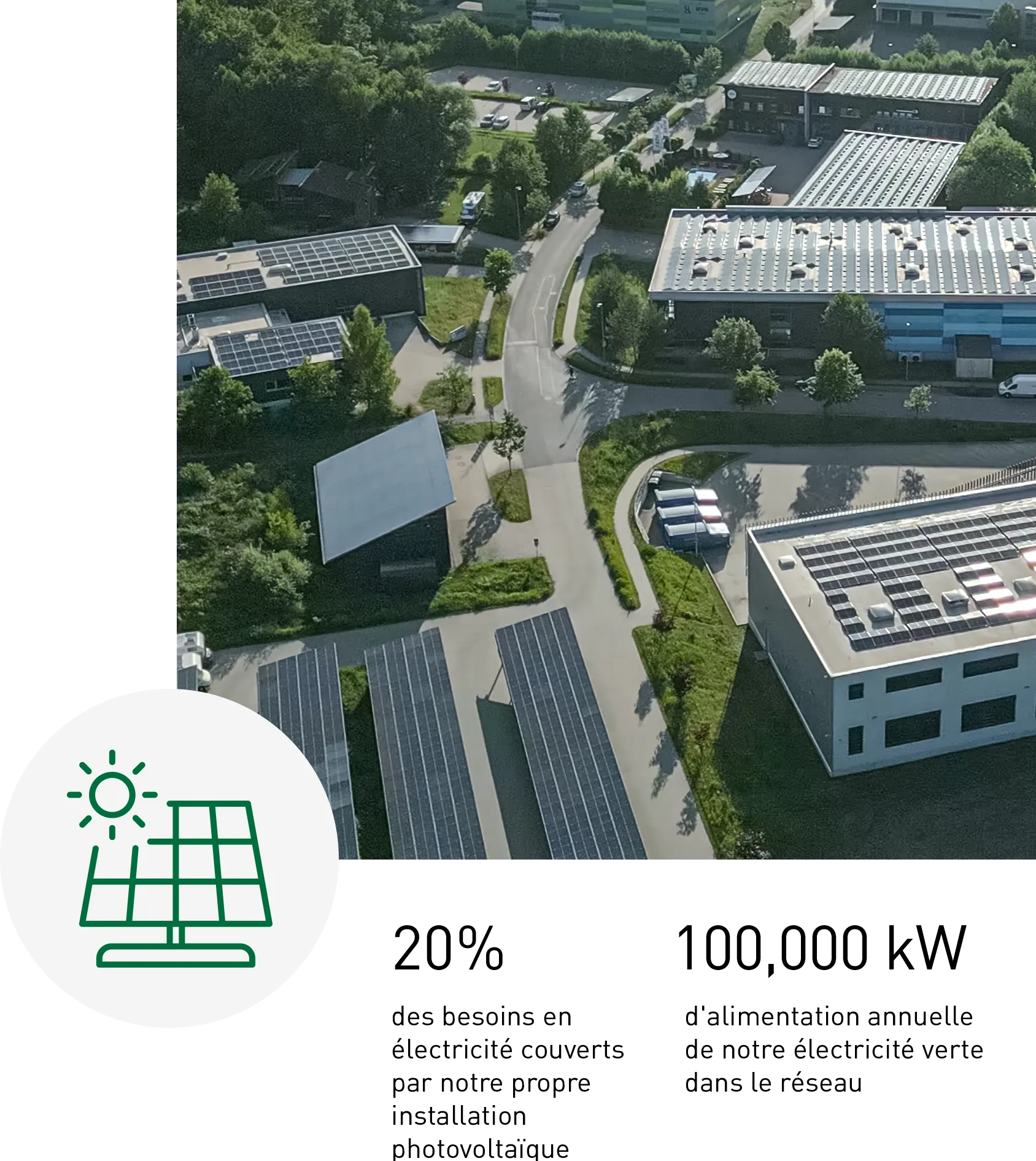 Ce que nous ne pouvons pas produire nous-mêmes, nous l'achetons de manière responsable : de l'électricité verte certifiée issue d'une production durable complète nos besoins et soutient la transition énergétique bien au-delà des portes de notre usine.