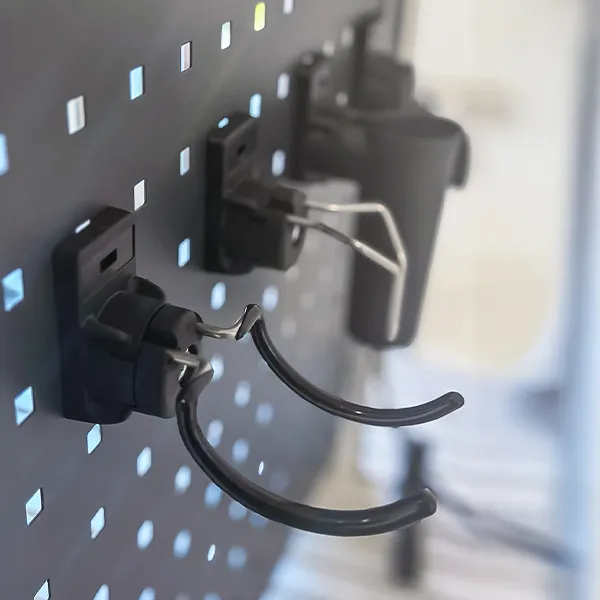 FATH Tool Holders FX are both practical as well as refined and attractive in design. Instead of pure steel constructions, the mounting modules as well as brackets and hooks are available in chic shapes and designs. Additionally, bright plastic adaptations and rubberized hooks visually make a nice impression! For square profile, round tube and tubular frame profile available immediately. The perforated sheet metal variant is compatible with opening grid 9 x 9 mm (8.7 x 8.7 mm).