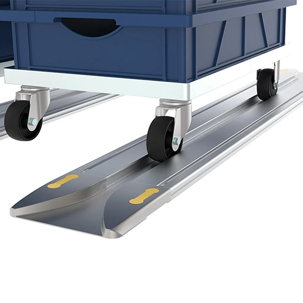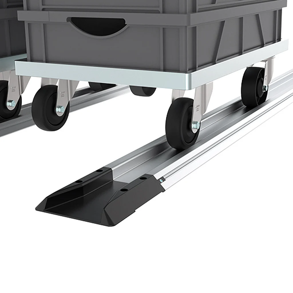 Space-saving single-sided rail guide, floating installation, insertion caps for easier loading with dollies available separately.