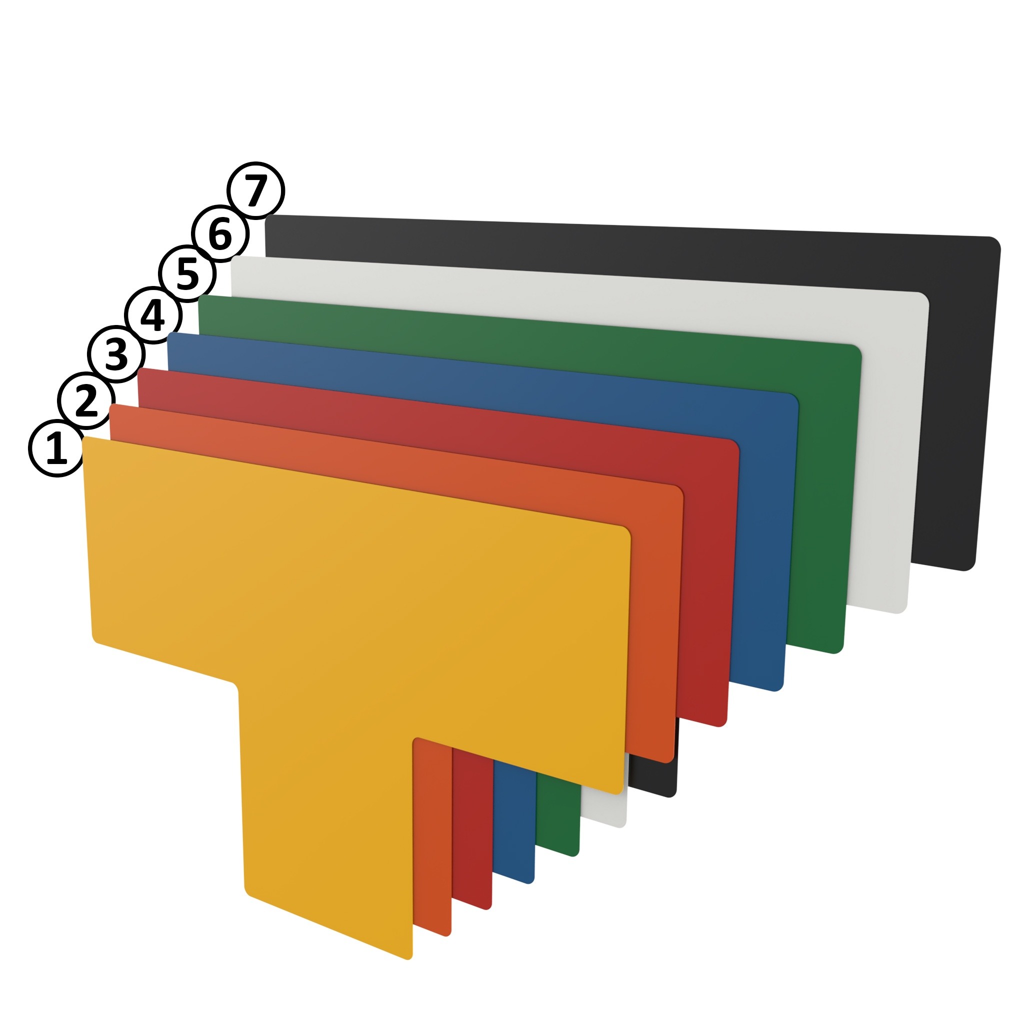 Jaune, rouge, bleu, vert, blanc, noir
