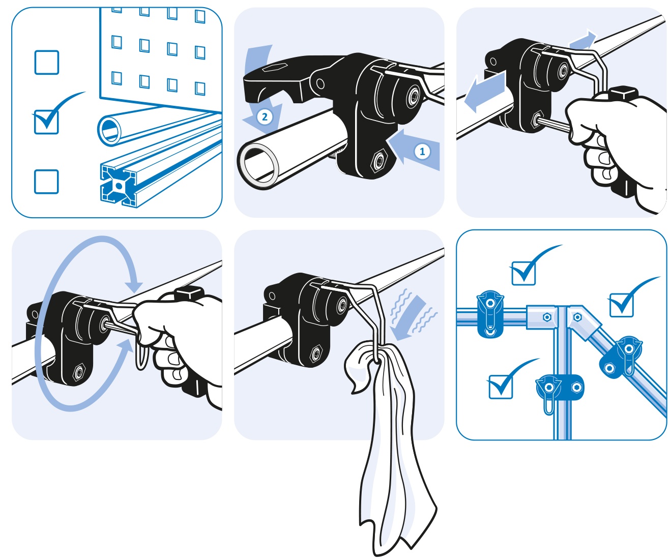 Ready to use cloth clip, 360° turnable, for tubes or tubular frame profiles;