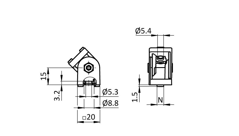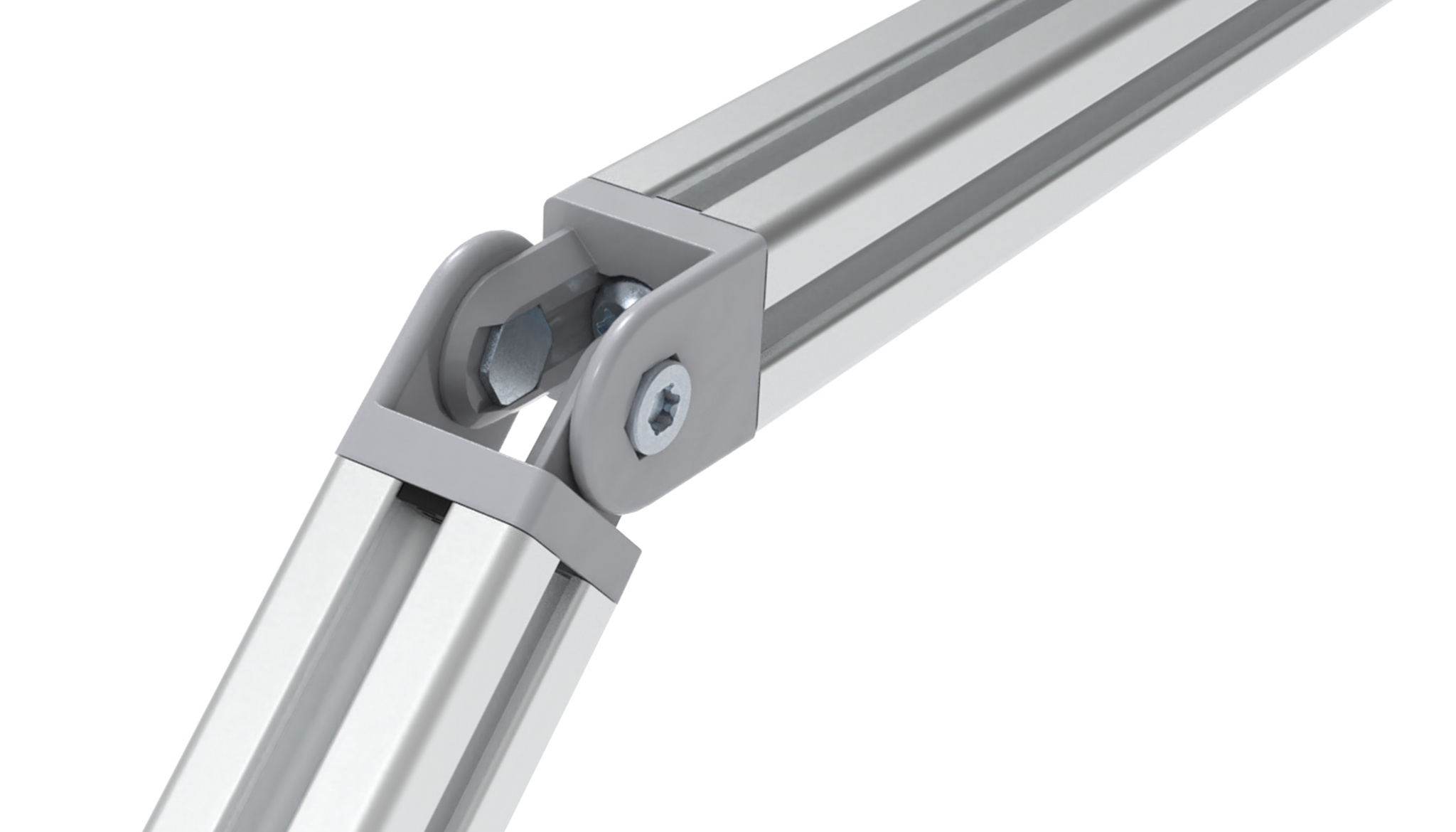 Pour réaliser une connection articulée entre deux profiles ou panneaux; Pions de centrage R5 et R6 optionel; par vissage ou devissage d'une vis et leKIPP-levier de serrage vous pouvez ajuster la duretée de l'articulation ou la bloquer dans une position