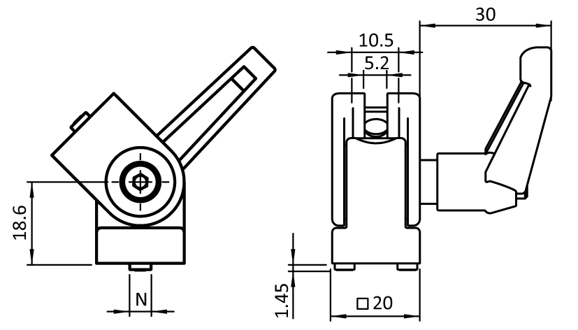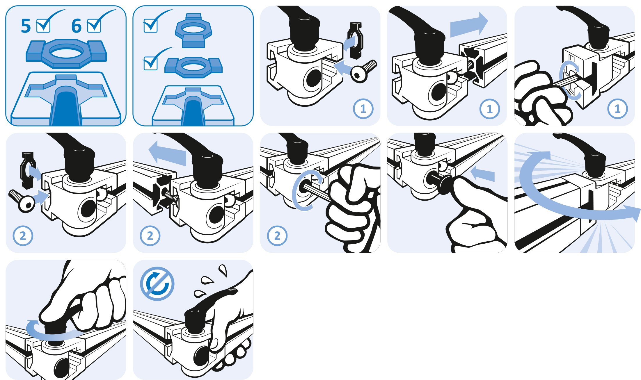 For connection of two profiles or panels, with attachment at any angle, fixed locating pins for slot 5 or 6 optional; by tightening or loosening the screws and the KIPP-locking lever you can adjust the frictional resistance of the joint continuously, or you can fix it at a defined position; thicker walls for stronger locking
